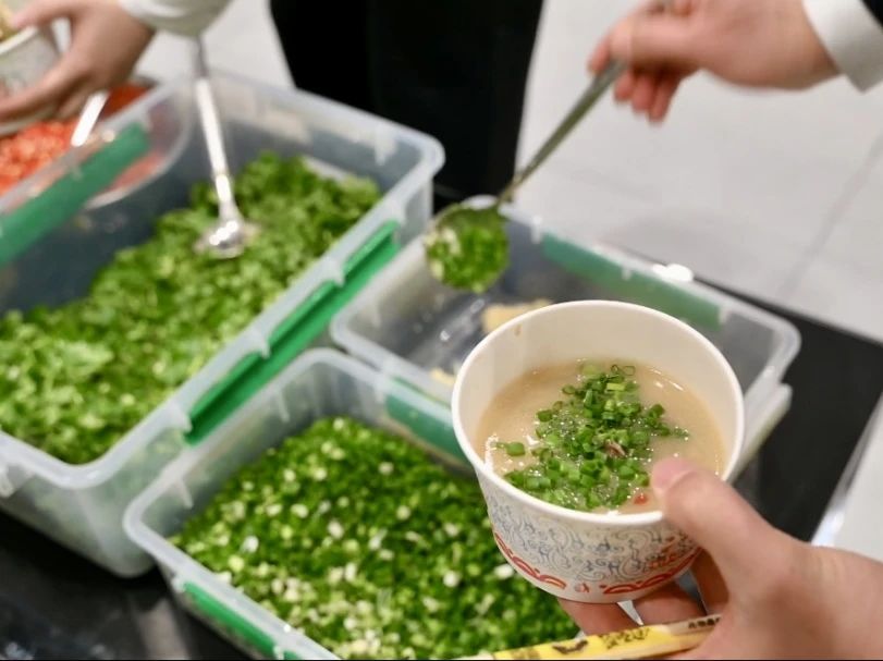 員工食堂里大家有序排隊,食堂師傅忙碌地為大家盛羊肉、打湯。鮮亮的湯色讓人垂涎欲滴,撒上蔥花、香菜,趁熱喝上一口,唇齒留香