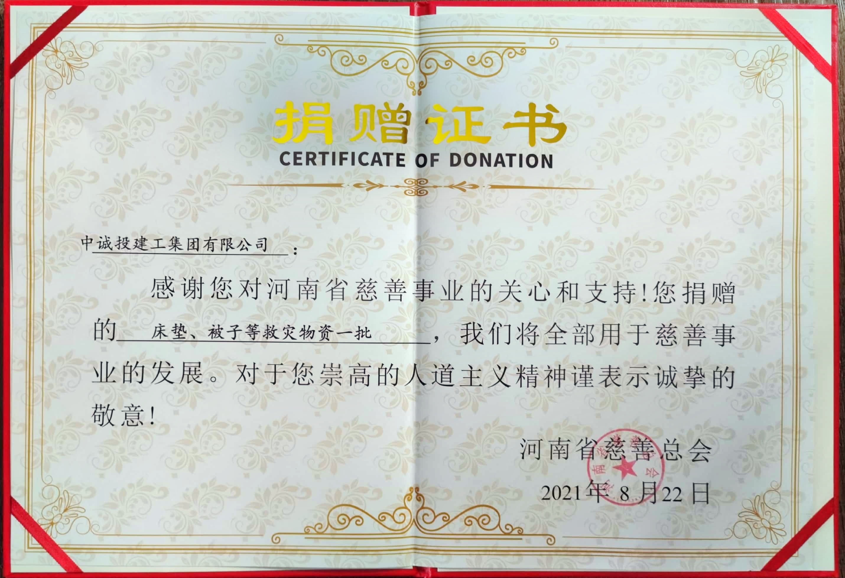 近日,河南慈善總會給中誠投建工集團發來捐贈證書及感謝信,對中誠投在“防汛抗洪,馳援河南”行動中,積極響應,慷慨解囊,捐款捐物,致以崇高敬意和衷心感謝。