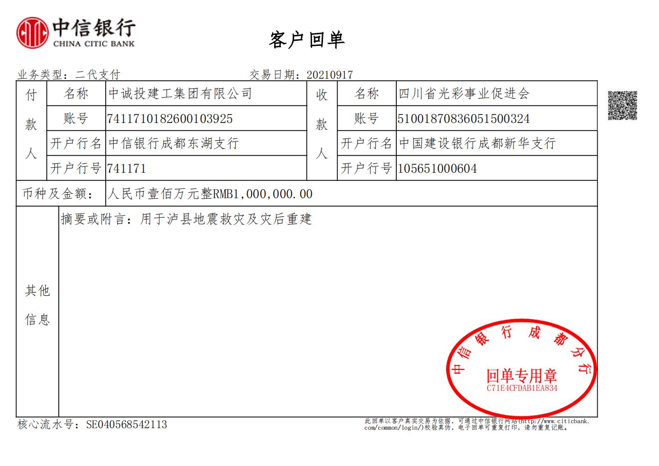 為切實履行社會責(zé)任,推動救災(zāi)工作順利進(jìn)行,幫助受災(zāi)地區(qū)群眾早日重建家園。9月17日,中誠投建工集團有限公司通過四川省光彩事業(yè)促進(jìn)會向瀘縣地震災(zāi)區(qū)捐贈現(xiàn)金100萬元。后續(xù),公司將積極與瀘州市慈善總會聯(lián)系,擬捐贈價值900萬元的救災(zāi)物資,用于支持災(zāi)區(qū)抗震救災(zāi)及災(zāi)后重建工作。