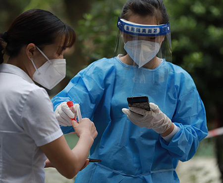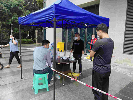 員工付英在居住小區(qū)擔(dān)任志愿者,協(xié)助核酸檢測點發(fā)放檢測物資,幫助居民掃碼錄入信息。