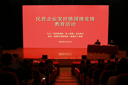 11月1日,四川省委統戰部、省工商聯、省光彩會在成都市新都區舉行了為期1天的民營企業家世情國情黨情教育活動。本次活動旨在學習宣傳貫徹黨的二十大精神,引導省工商聯、省光彩會新一屆兼職領導班子成員堅定理想信念、提升履職能力、強化使命擔當,以實際行動推動全省“兩個健康”事業、光彩事業再上新臺階。省委統戰部副部長、省工商聯黨組書記唐強,省工商聯主席唐燕,省工商聯、省光彩會新一屆領導班子成員,省委統戰部二級巡視員李明全及有關處室負責人,省工商聯機關干部共近100人參加了活動。
