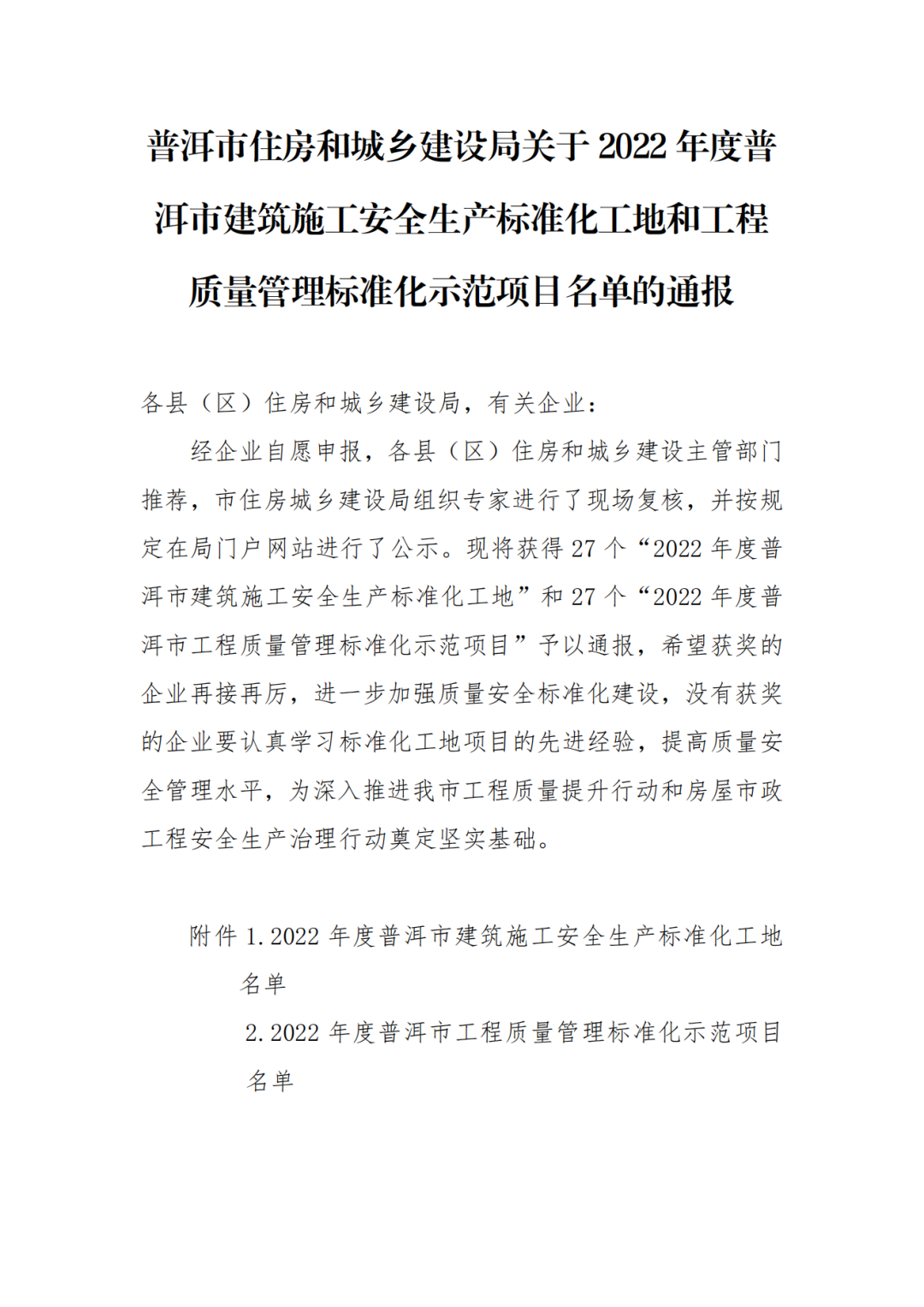 近期,云南省普洱市住房和城鄉(xiāng)建設(shè)局發(fā)布了《關(guān)于2022年度普洱市建筑施工安全生產(chǎn)標(biāo)準(zhǔn)化工地和工程質(zhì)量管理標(biāo)準(zhǔn)化示范項(xiàng)目名單的通報(bào)》,由集團(tuán)公司承建的家益春風(fēng)云庭三標(biāo)項(xiàng)目喜獲2022年度普洱市“建筑施工安全生產(chǎn)標(biāo)準(zhǔn)化工地”和“工程質(zhì)量管理標(biāo)準(zhǔn)化示范項(xiàng)目”兩項(xiàng)榮譽(yù)。