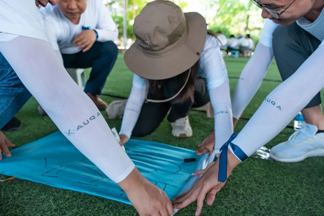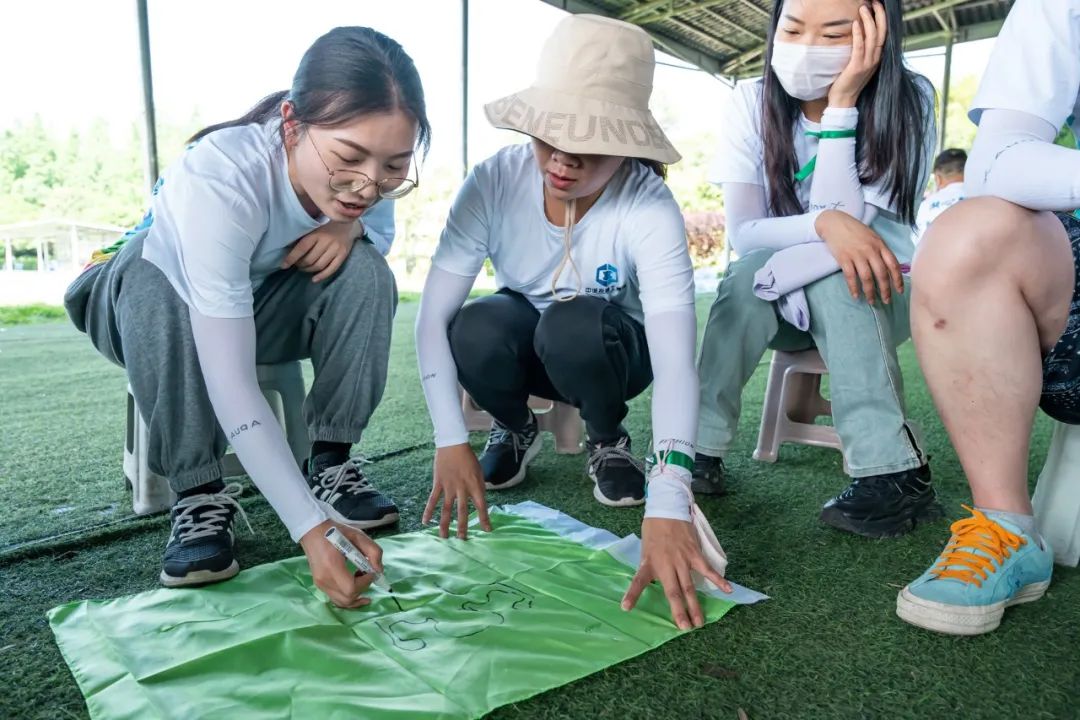 迎著朝陽,聞著花香,大家熱情洋溢、激情四射。經過簡單的熱身活動后,在教練的指揮下,大家迅速組成8支隊伍。選隊長、畫隊旗、喊口號、唱隊歌,擺隊形,活動現場氛圍一下子就熱鬧了起來。“我要飛得更高,飛得更高……”“團結就是力量……”“葫蘆娃,葫蘆娃,風吹雨打都不怕……”飛盤拓展項目在各隊嘹亮的隊歌聲中拉開帷幕。