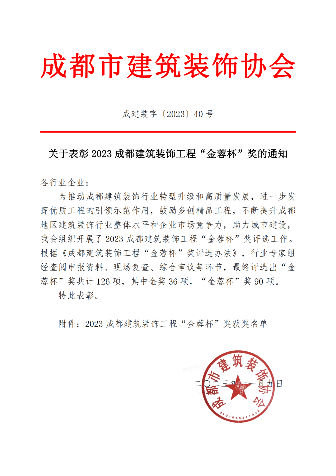 “金蓉杯”獎是成都市建筑裝飾工程最高榮譽獎項,由成都市建筑裝飾協(xié)會組織評選,旨在鼓勵建筑企業(yè)提高施工質(zhì)量及管理水平,增強低碳環(huán)保意識,多創(chuàng)精品工程,不斷提升成都地區(qū)建筑裝飾行業(yè)整體水平和企業(yè)市場競爭力,助力城市建設。