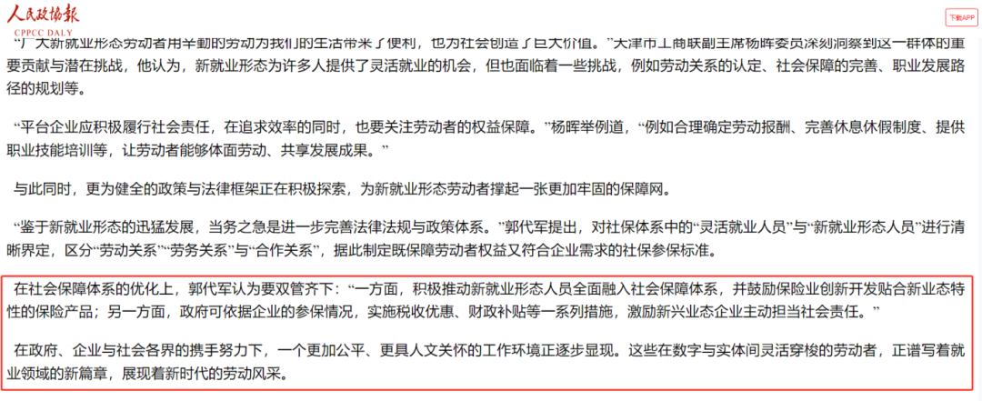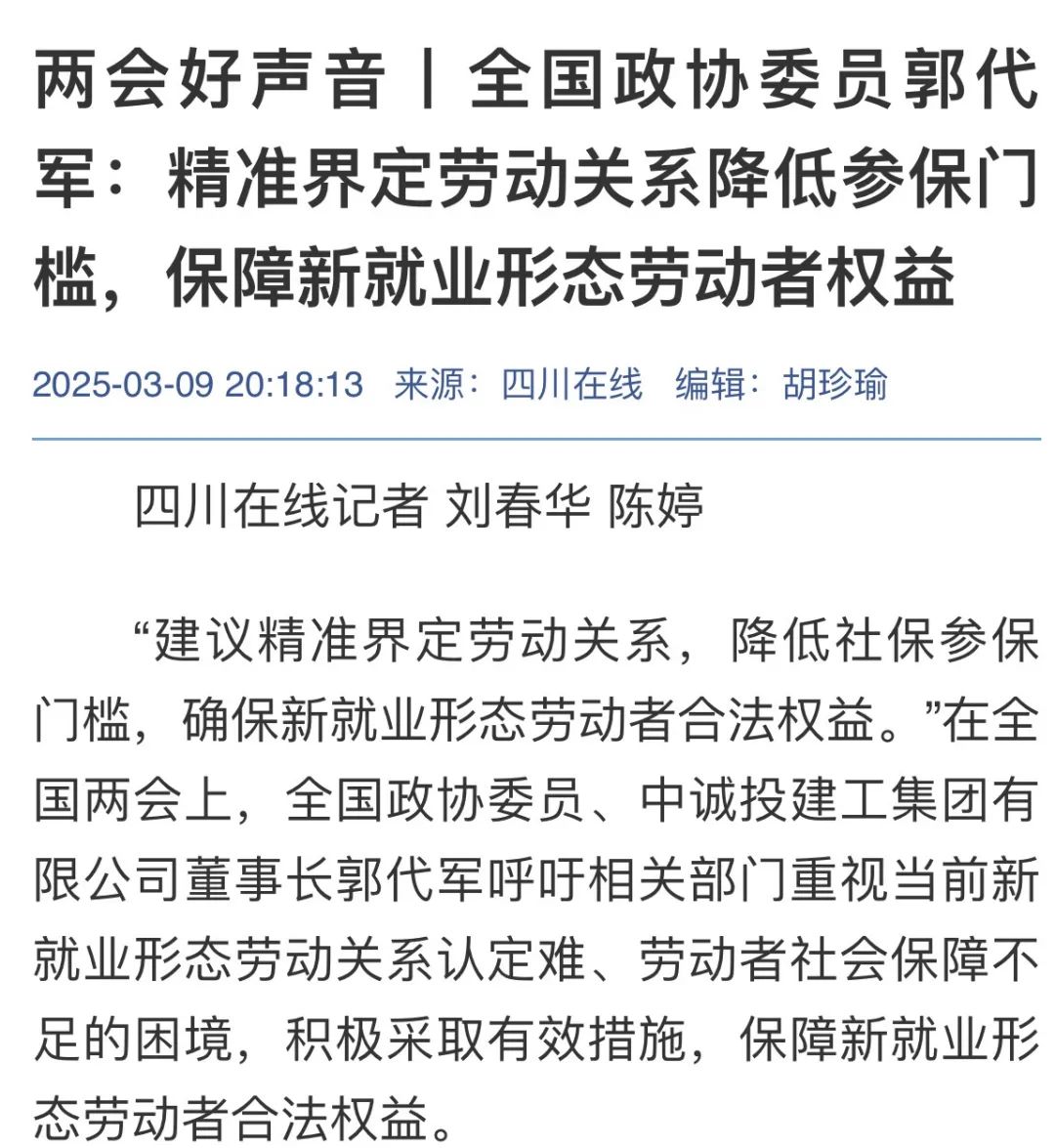 政府工作報告提出“加強靈活就業和新就業形態勞動者權益保障”。如何在新就業形態下有效保障勞動者的權益?郭代軍帶來了自己的思考——