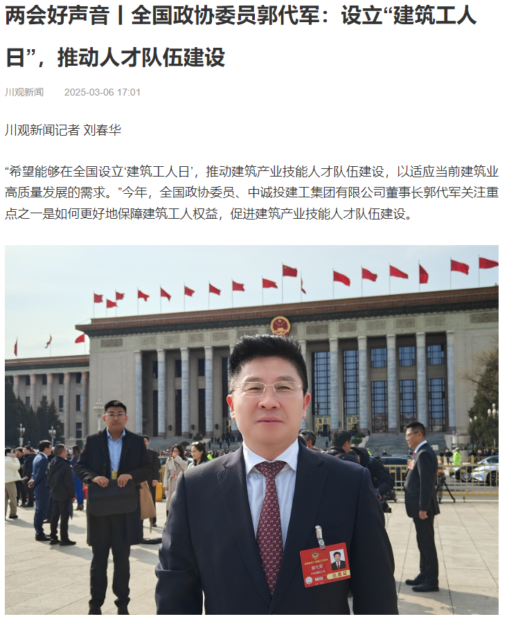 “今年參加全國兩會,我關注的是如何推動建筑行業的高質量發展,以及如何更好地保障建筑工人的權益。”四川省全國政協委員、中誠投建工集團有限公司董事長郭代軍建議,通過政策引導和資金扶持,推動建筑行業數字化轉型,助力建筑產業新質生產力的培育。進一步完善建筑產業工人的勞動保障制度,加強對建筑工人職業技能培訓的投入,推動建筑產業工人隊伍向知識型、技能型、創新型轉型。(四川政協報見習記者:黃笑菲)